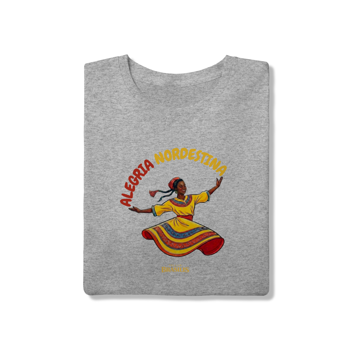 A expressão corporal revela hospitalidade, resistência e orgulho de um povo que transforma desafios em celebração. A palavra “Alegria Nordestina” em destaque reforça esse sentimento coletivo de viver com intensidade, fé e esperança, marcas registradas da região.