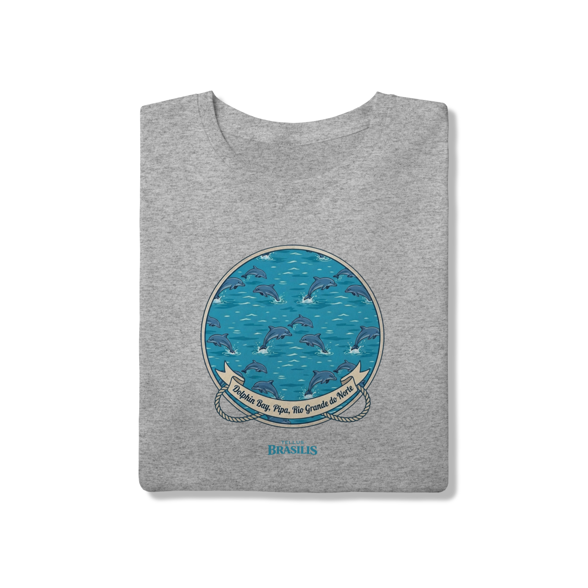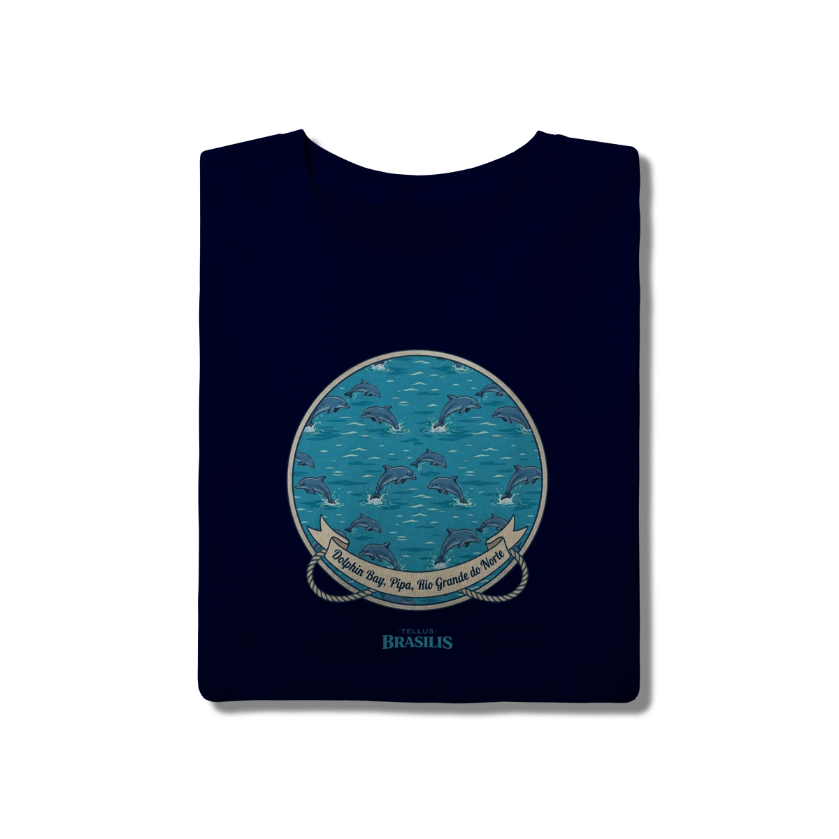 A estampa celebra o lado mais encantador e divertido da Baía dos Golfinhos, um dos cenários mais queridos da Praia de Pipa, no Rio Grande do Norte. Com ilustrações cheias de movimento, os golfinhos aparecem saltando e brincando no mar azul, transmitindo a sensação de alegria, liberdade e contato direto com a natureza — exatamente como é a experiência real de quem visita a região.