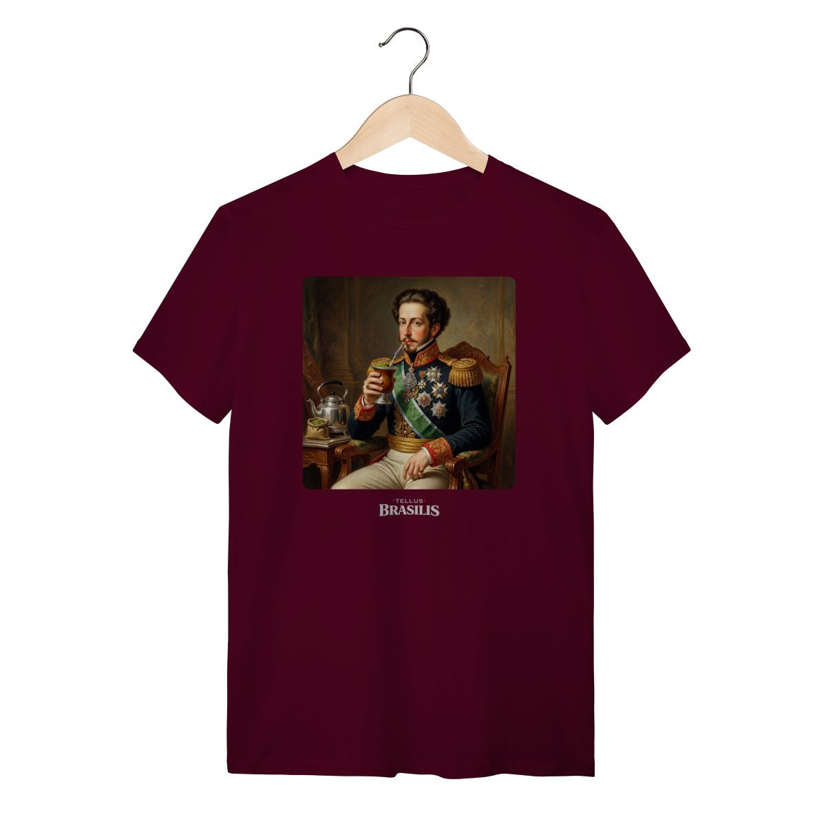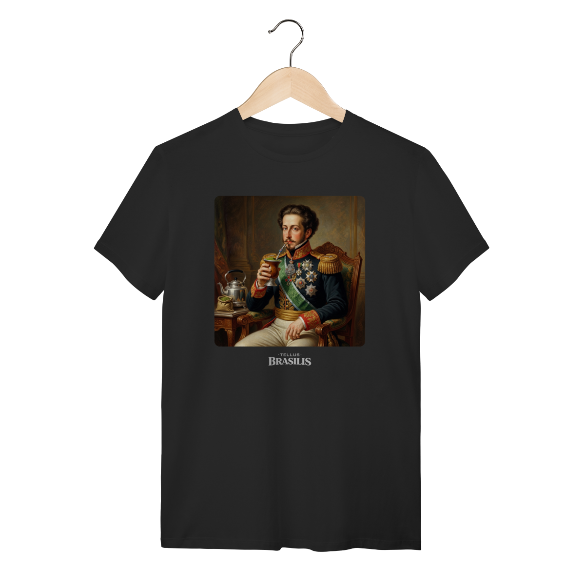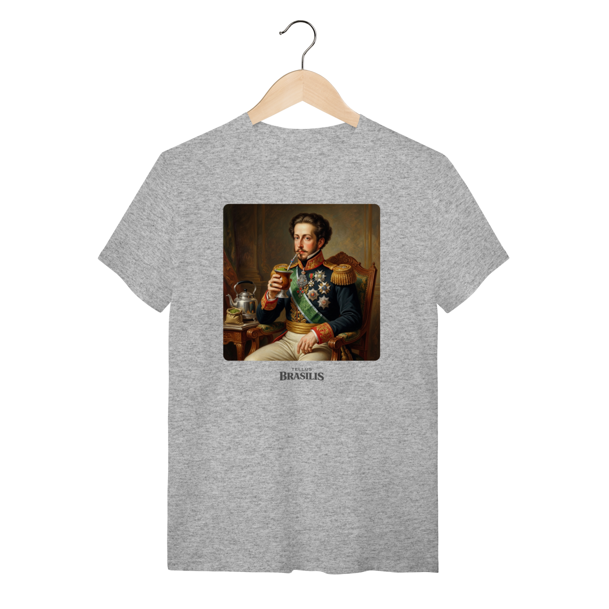 A arte brinca com o encontro entre história e cultura popular, unindo o Brasil imperial ao costume gaúcho de “matear”, em um diálogo leve, inteligente e cheio de identidade. O resultado é uma estampa marcante, ideal para quem gosta de referências históricas reinterpretadas com humor e criatividade.