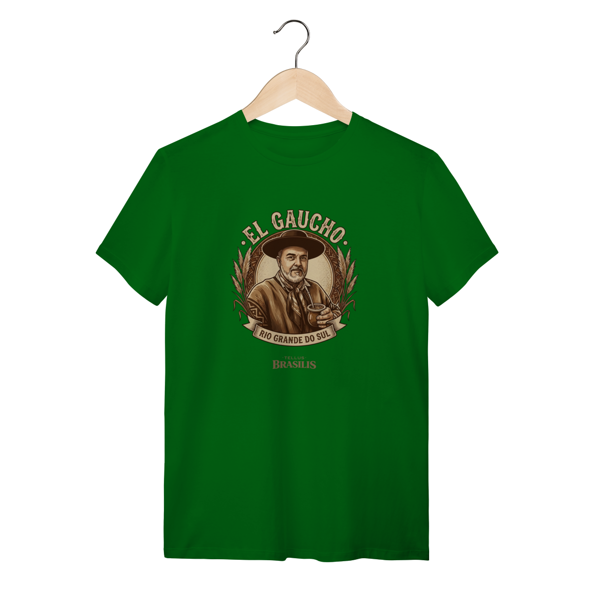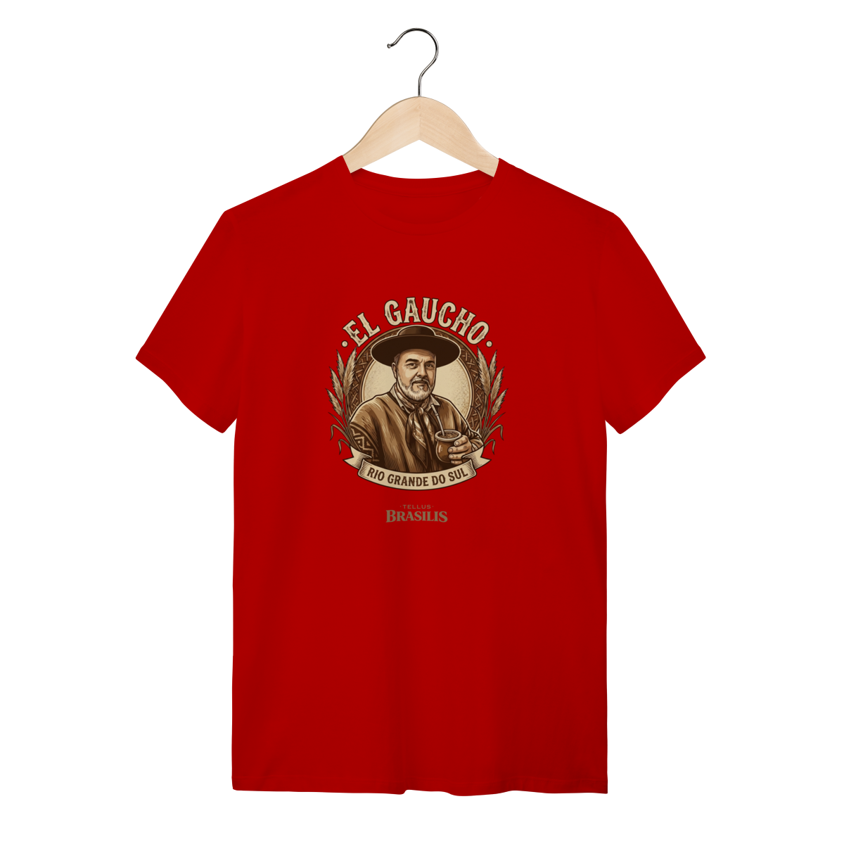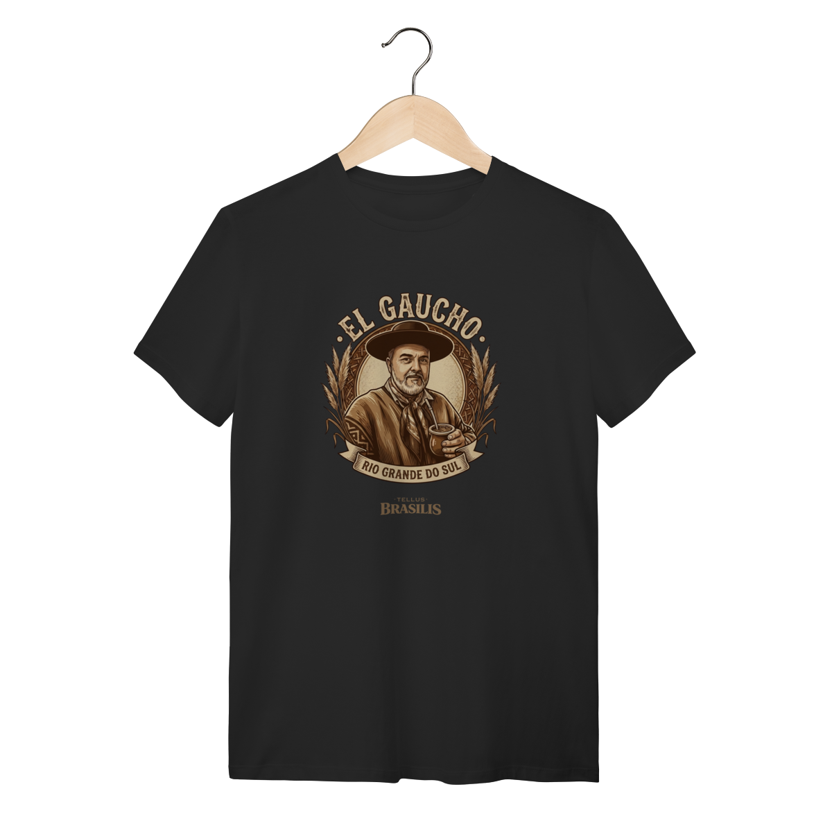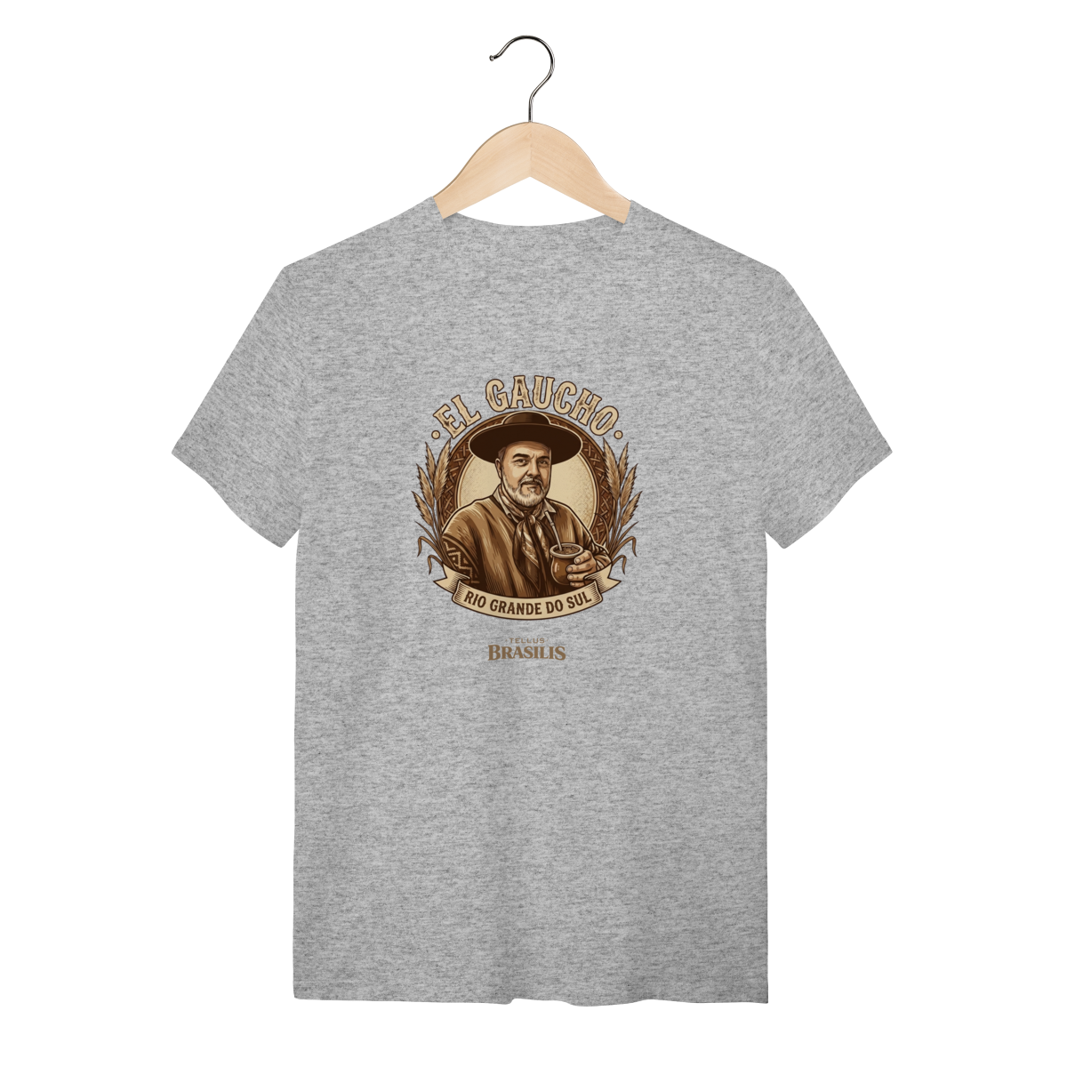 Esta camisa homenageia com elegância e orgulho a identidade gaúcha do Rio Grande do Sul. A arte traz a figura clássica do gaúcho, de chapéu e lenço no pescoço, segurando o chimarrão — símbolo maior da hospitalidade, da tradição e do cotidiano nos pampas. O estilo vintage, em tons terrosos, remete à vida campeira, às estâncias e à história construída com coragem e honra.