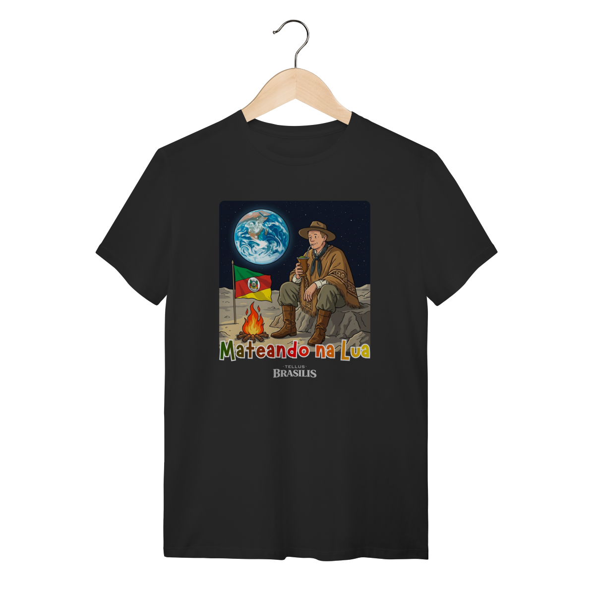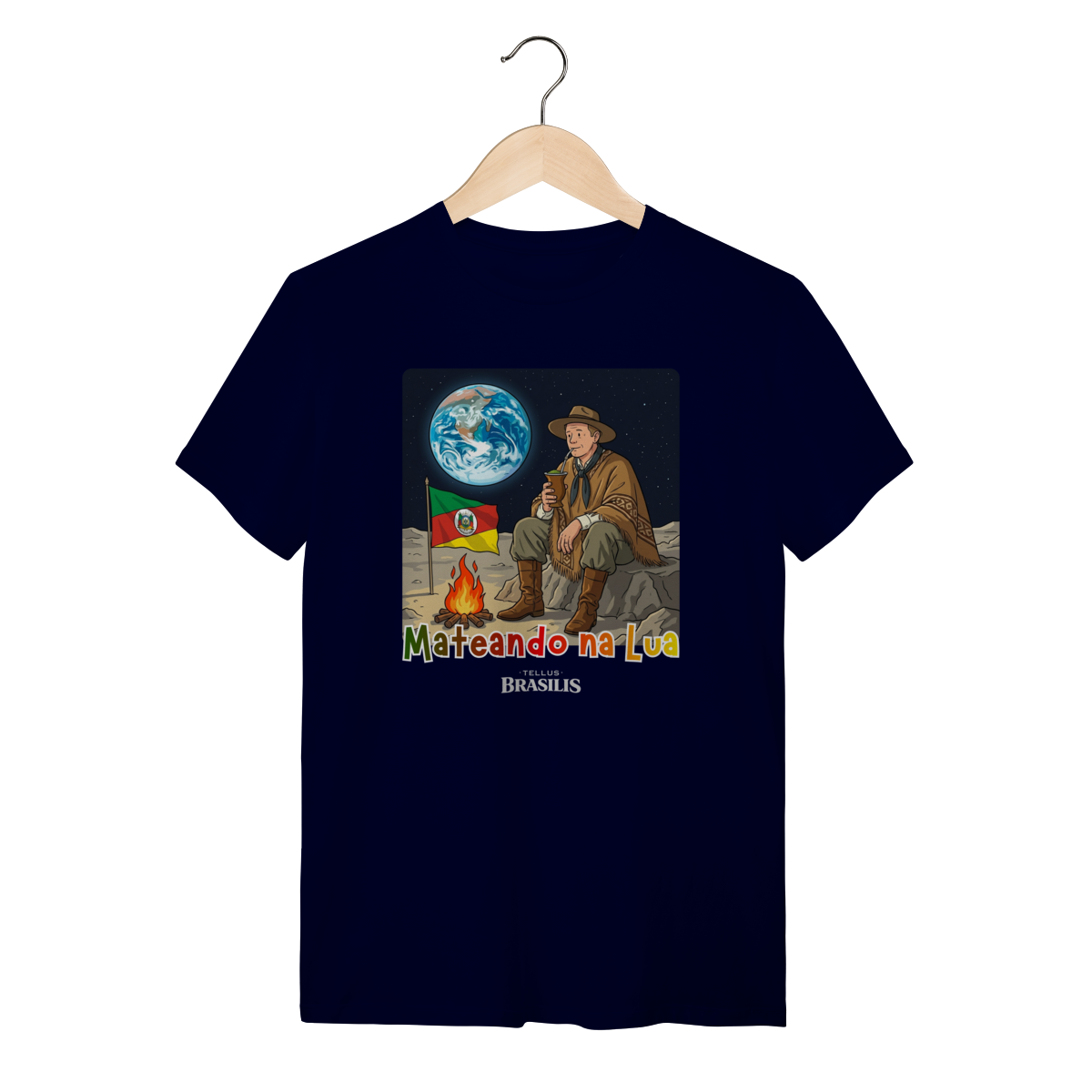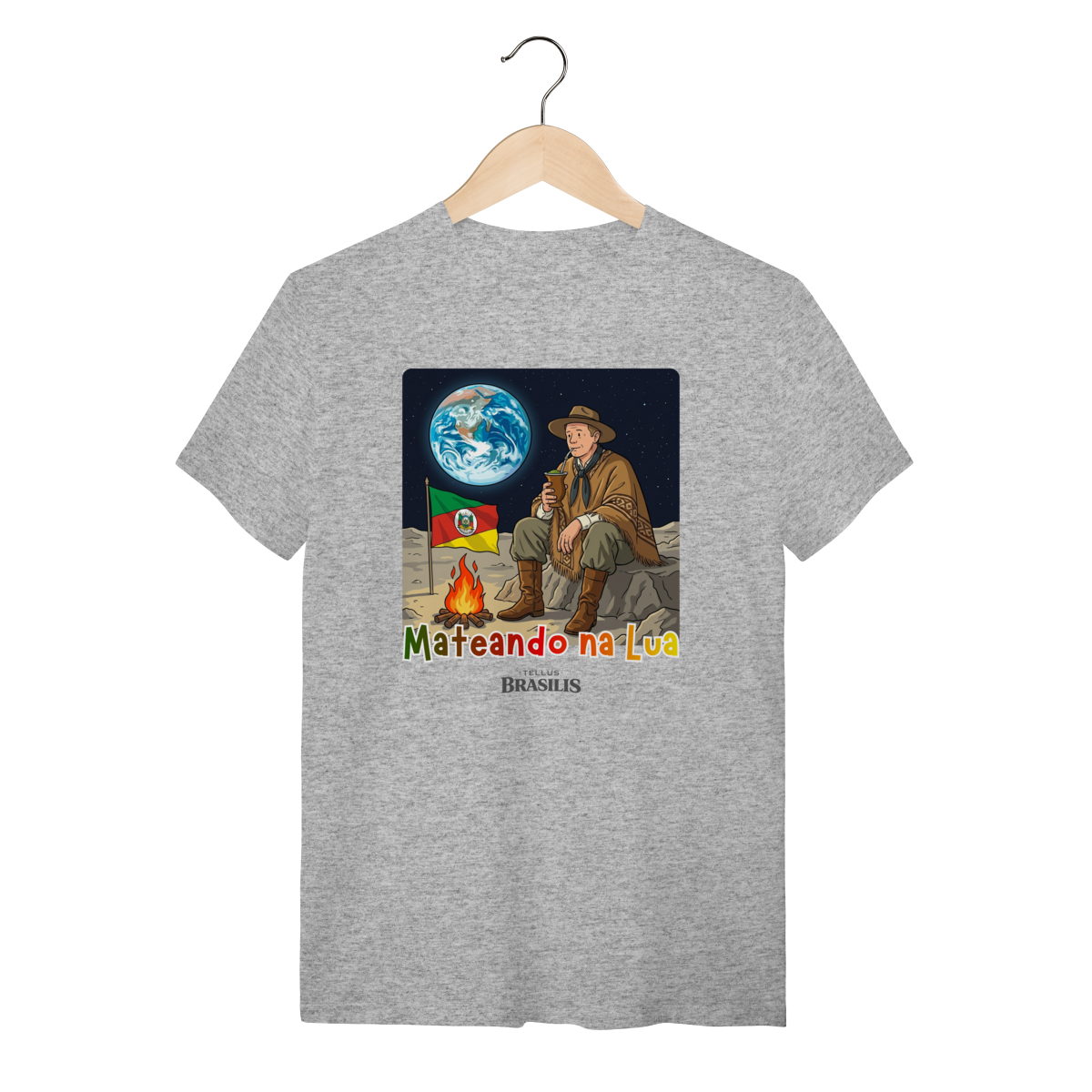 Uma cena que mistura orgulho, humor e imaginação: a estampa retrata um gaúcho mateando na Lua, como se dissesse que, onde o ser humano chega, o chimarrão chega junto. Sentado sobre o solo lunar, ao lado do fogo de chão e com a bandeira do Rio Grande do Sul fincada com respeito, ele observa a Terra ao fundo enquanto saboreia o mate — tranquilo, como em qualquer amanhecer no pampa.