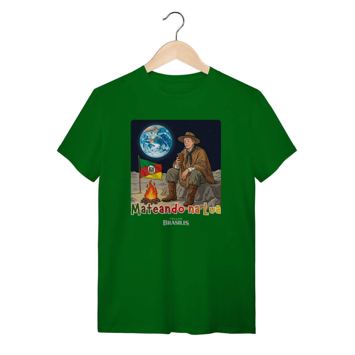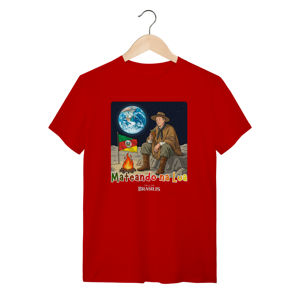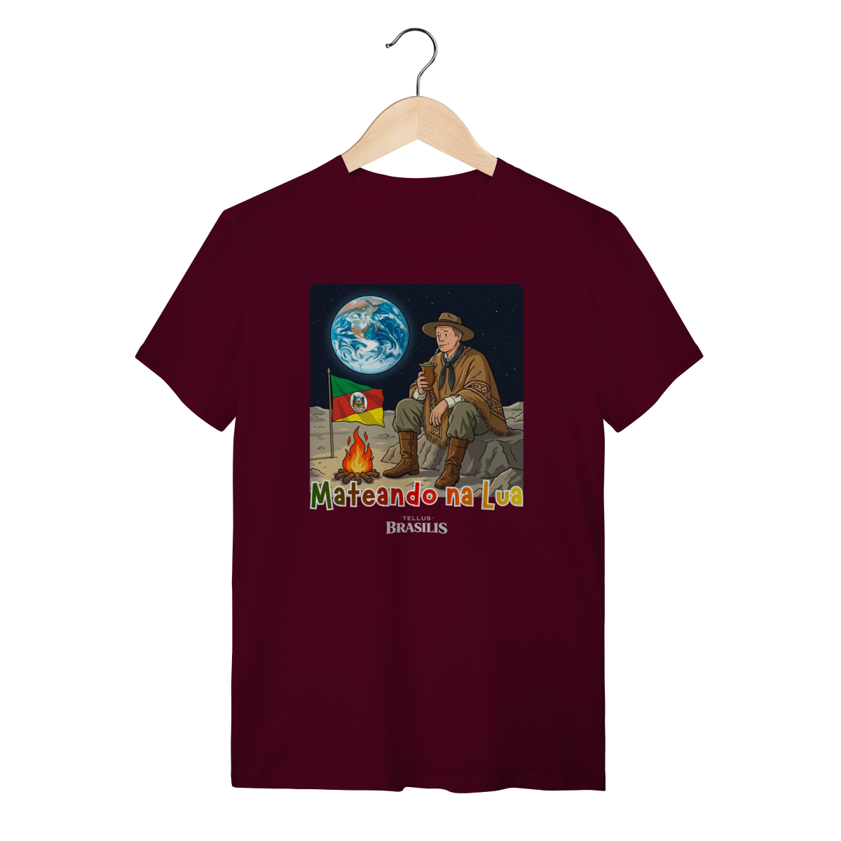 Uma cena que mistura orgulho, humor e imaginação: a estampa retrata um gaúcho mateando na Lua, como se dissesse que, onde o ser humano chega, o chimarrão chega junto. Sentado sobre o solo lunar, ao lado do fogo de chão e com a bandeira do Rio Grande do Sul fincada com respeito, ele observa a Terra ao fundo enquanto saboreia o mate — tranquilo, como em qualquer amanhecer no pampa.