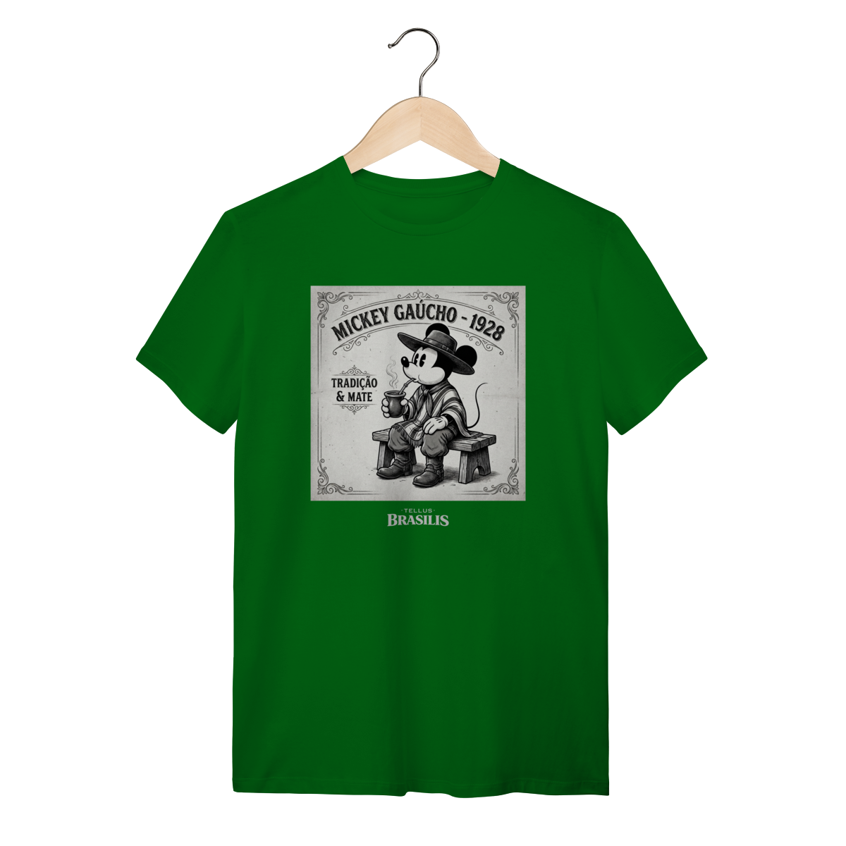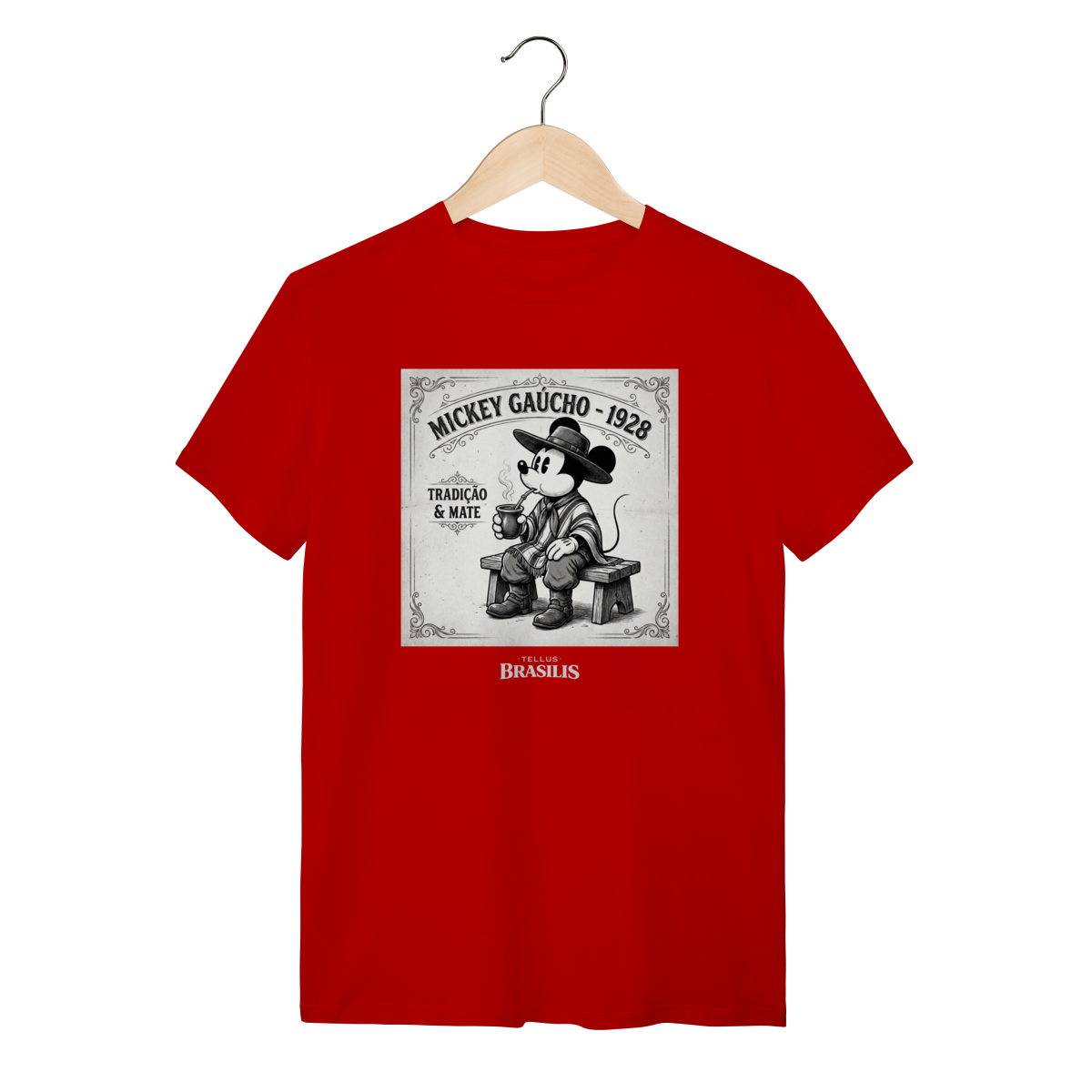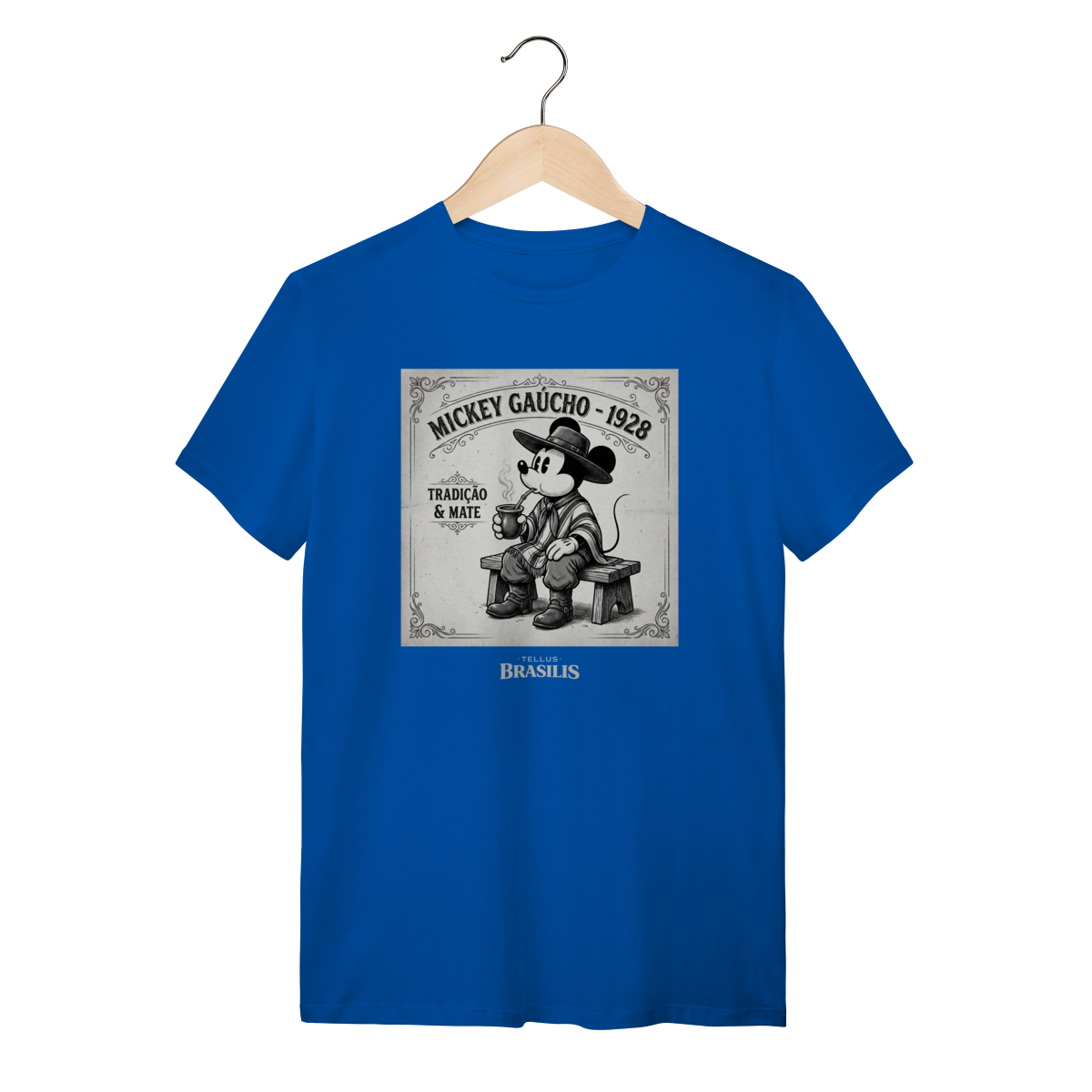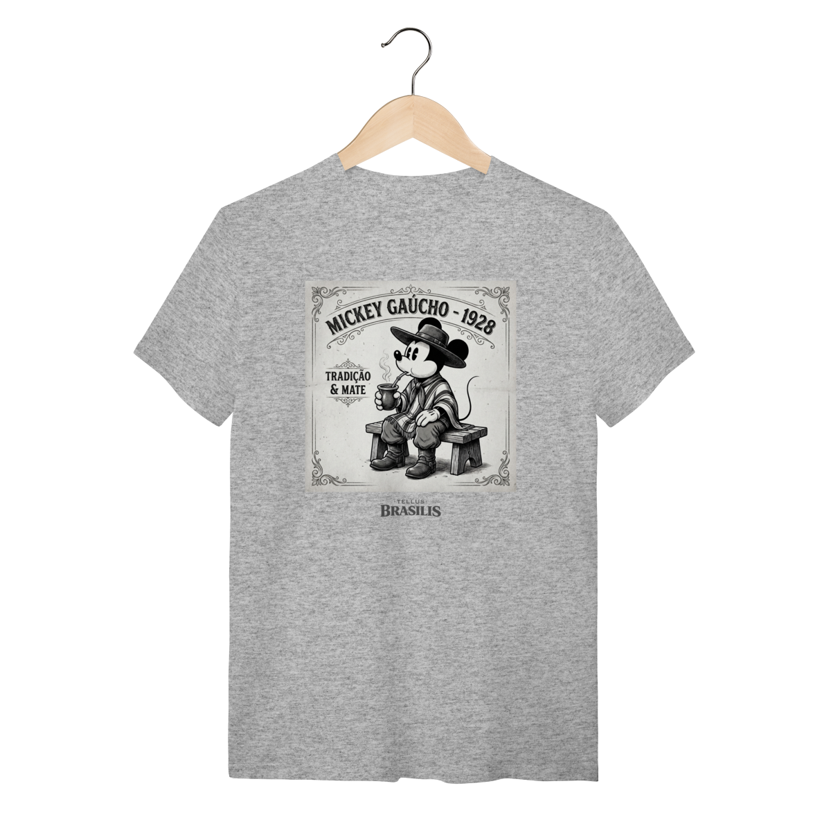 Uma estampa que mistura nostalgia, tradição e bom humor. Inspirada no Mickey de 1928, a arte traz o personagem em versão gaúcha, sentado no banquinho, pilchado, chapéu na cabeça e mateando com toda a calma de quem respeita o tempo do chimarrão. O traço vintage em preto e branco reforça o clima retrô, enquanto os detalhes do mate e da indumentária gaúcha dão identidade e personalidade à cena.