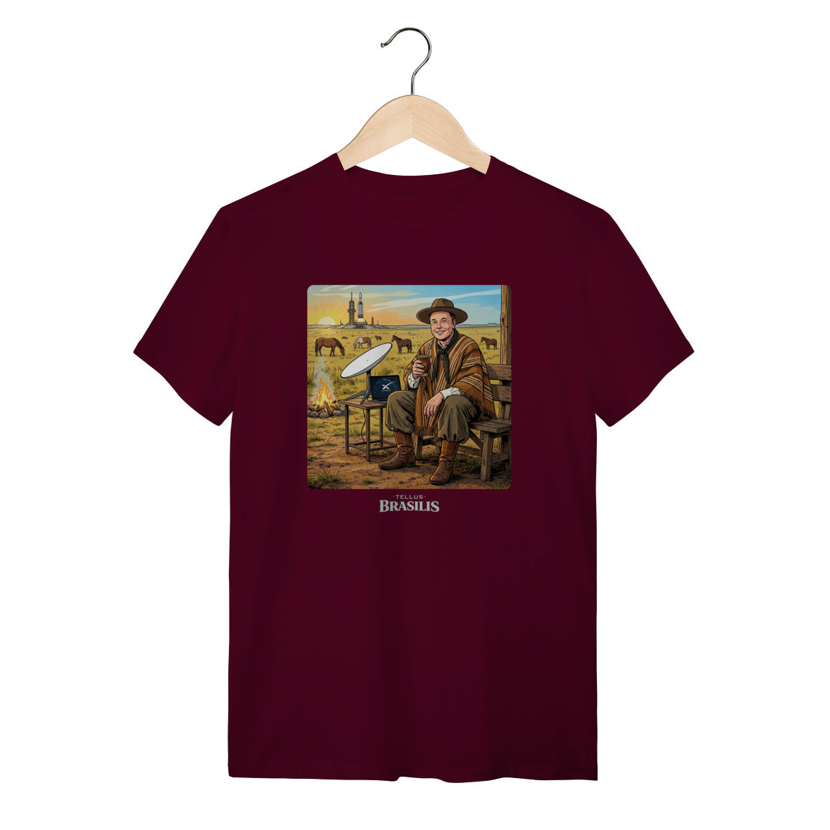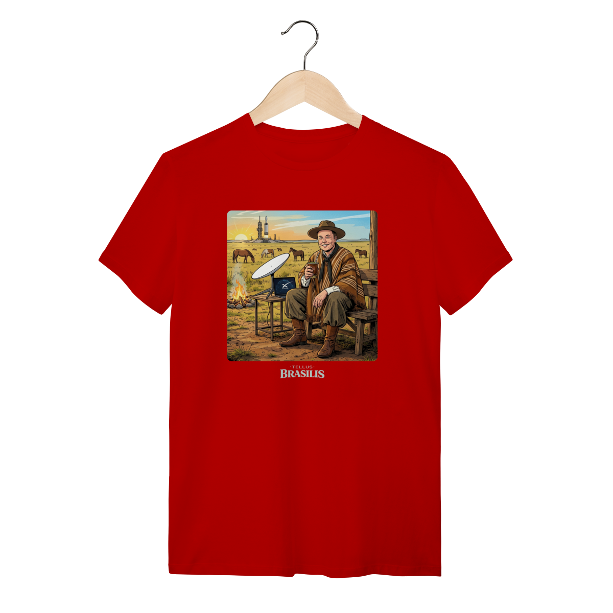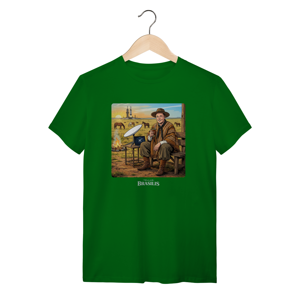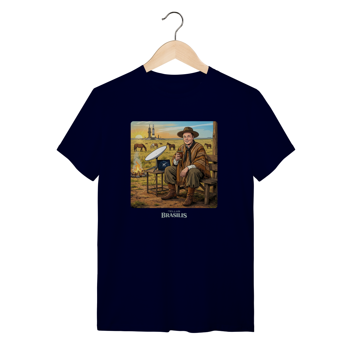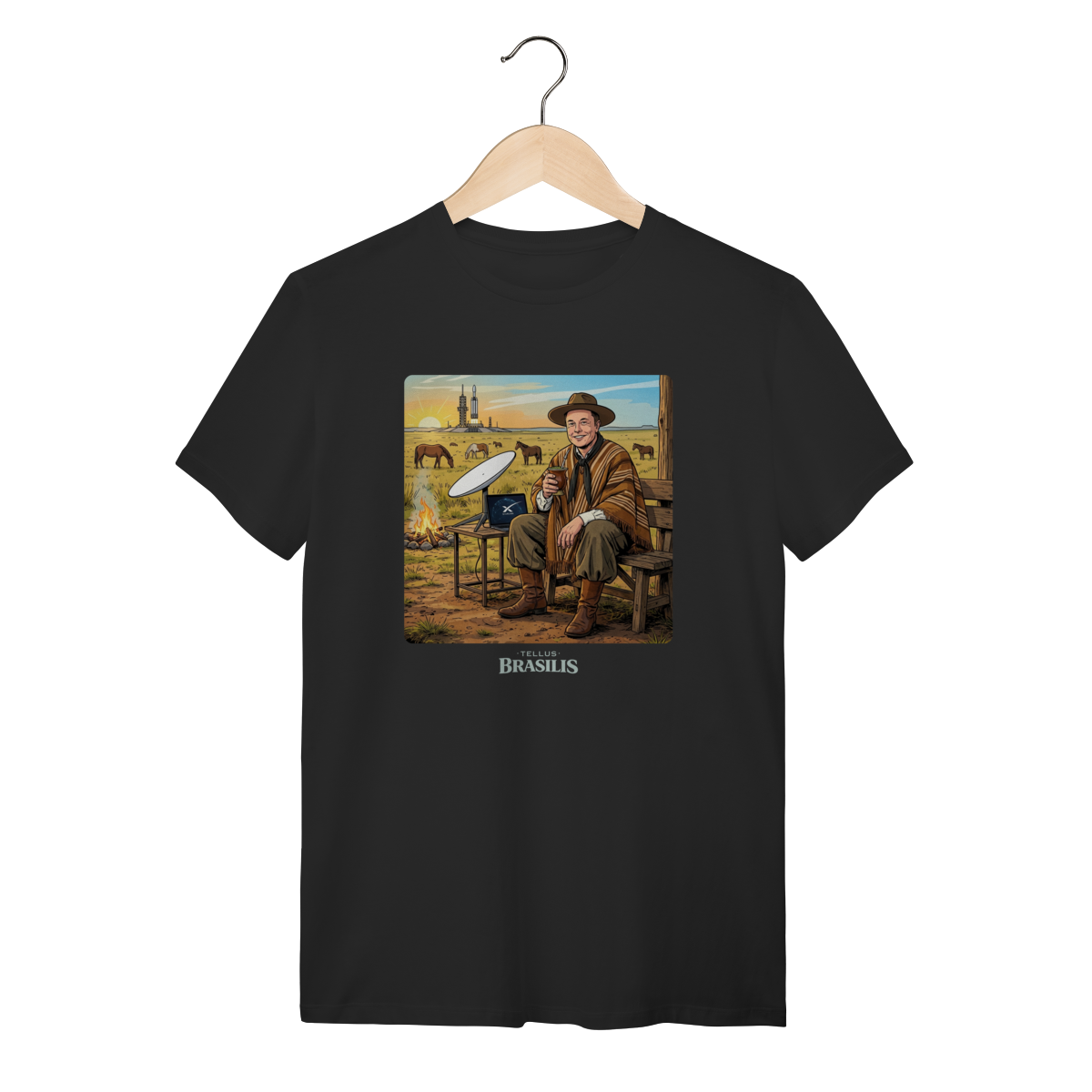 Uma cena improvável e hilária: inspirada no universo de Elon Musk, a estampa mistura o futuro com a tradição gaúcha. Enquanto a tecnologia espacial desponta ao fundo, o personagem — de bombacha, chapéu e sorriso confiante — faz uma pausa estratégica para matear, segurando o chimarrão como quem diz: “antes de ir a Marte, um gole de erva-mate”.