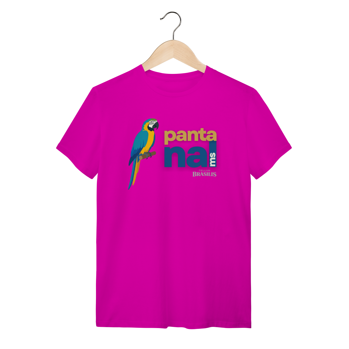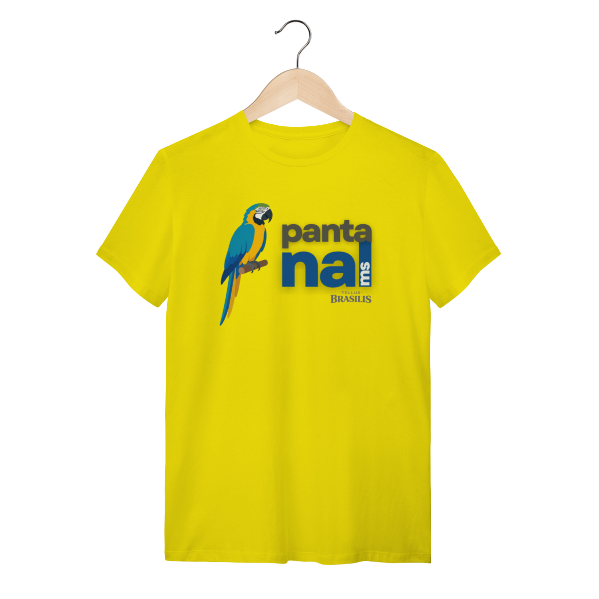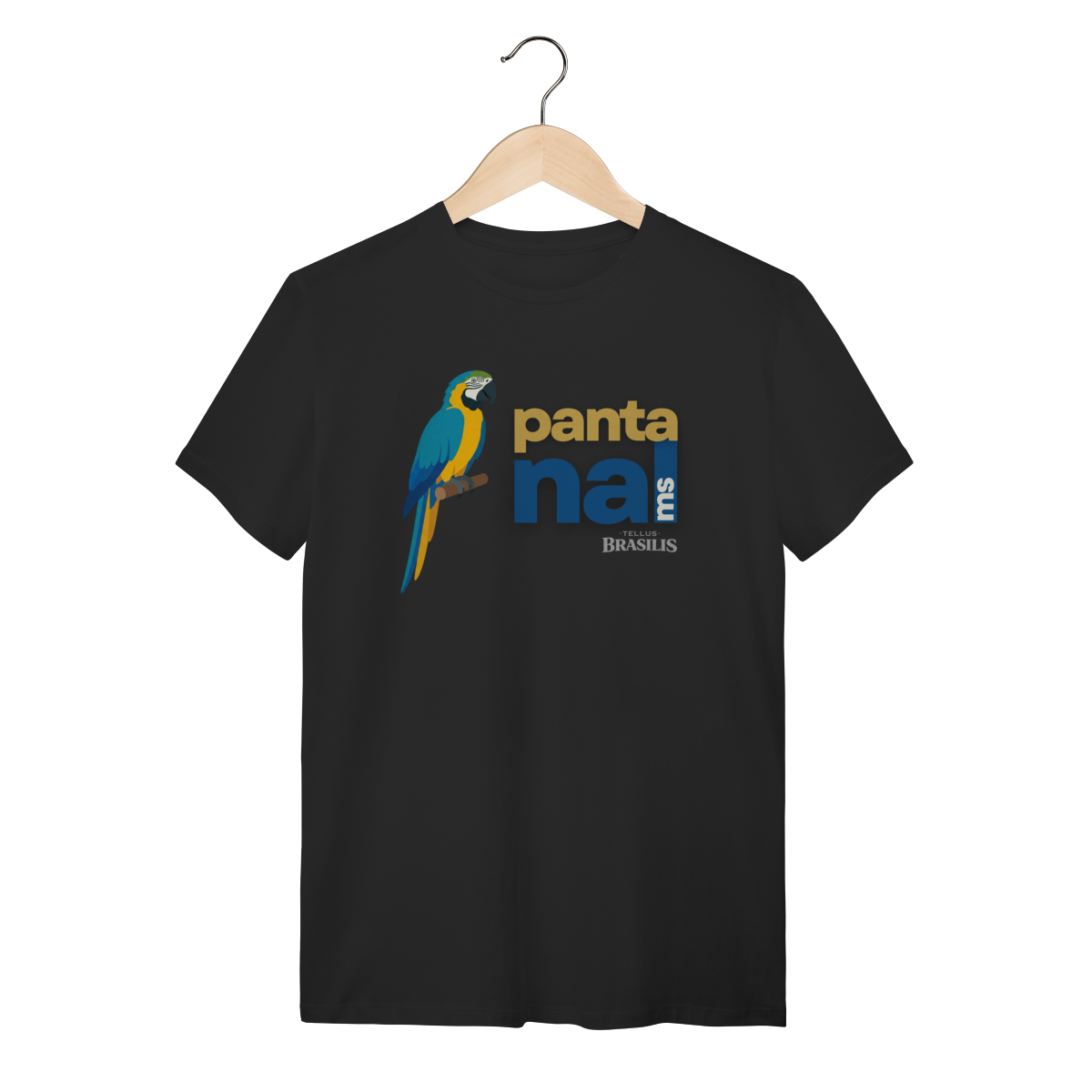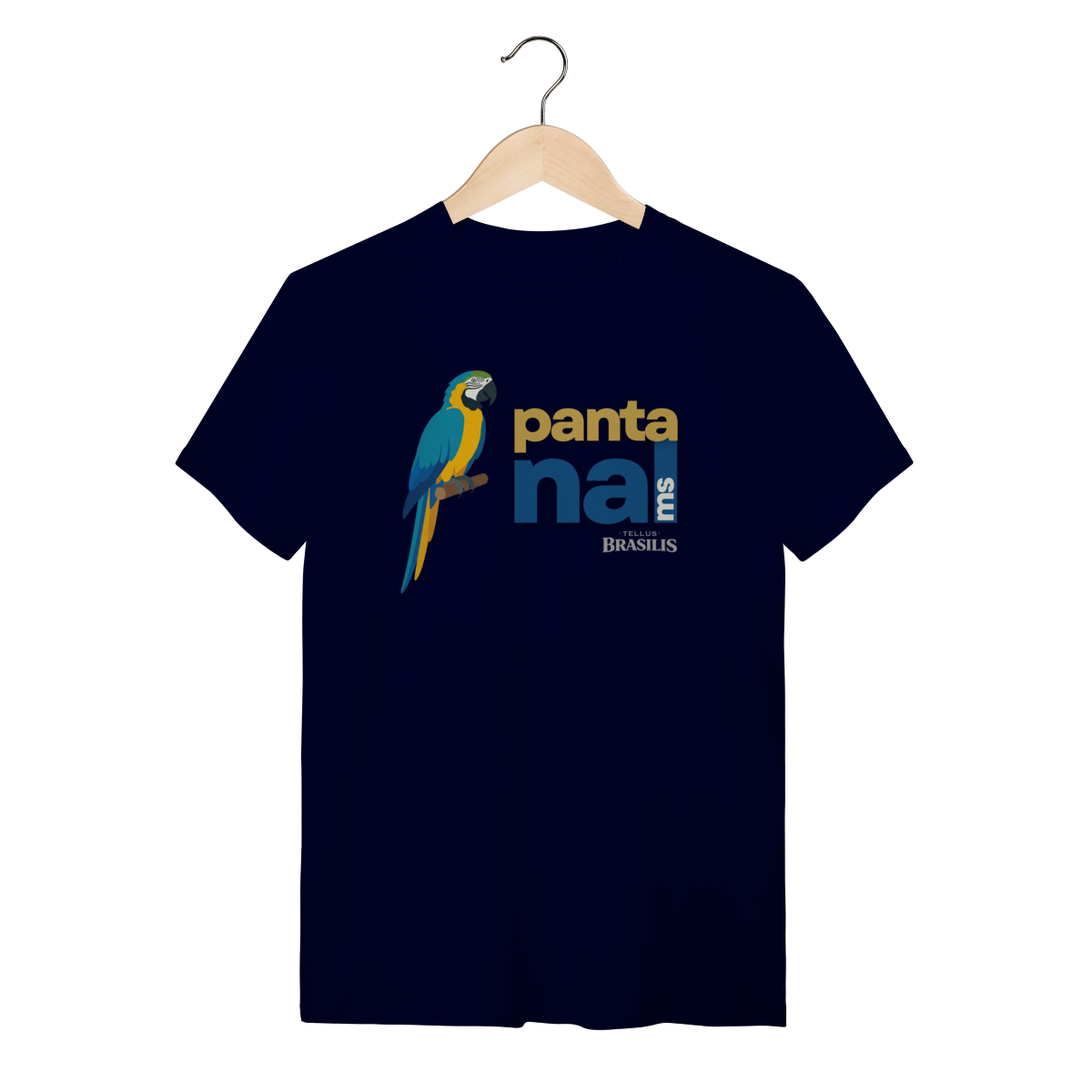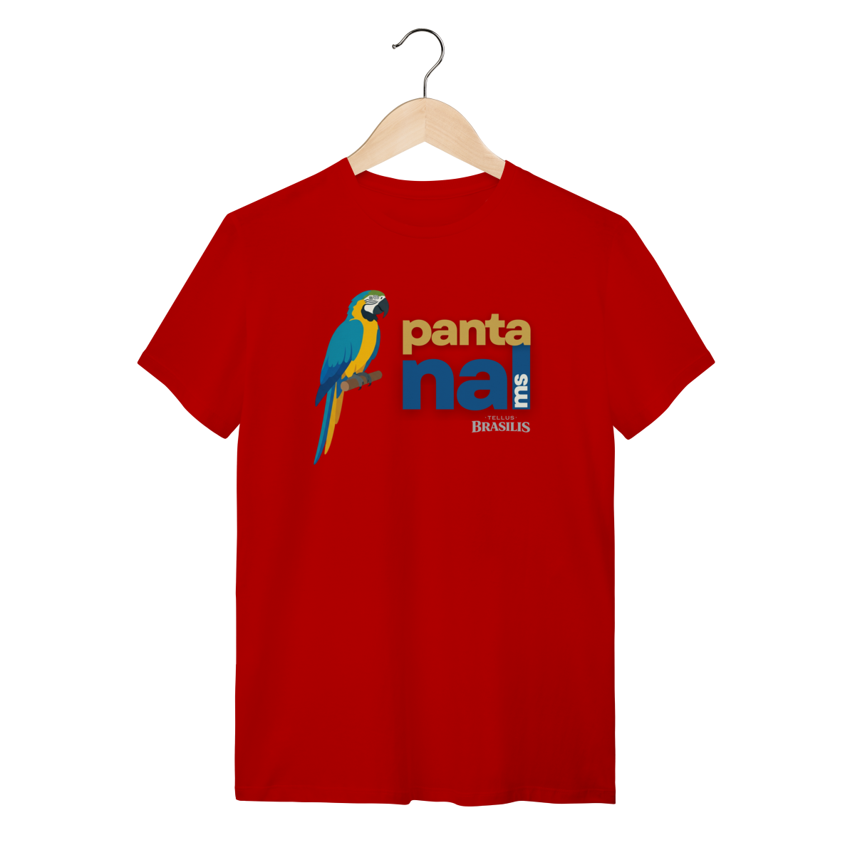 A arara aparece em posição serena e imponente, transmitindo equilíbrio, liberdade e conexão com a natureza. O texto “Pantanal MS” reforça o orgulho regional e a ligação direta com o território sul-mato-grossense, criando uma estampa contemporânea, limpa e cheia de significado.