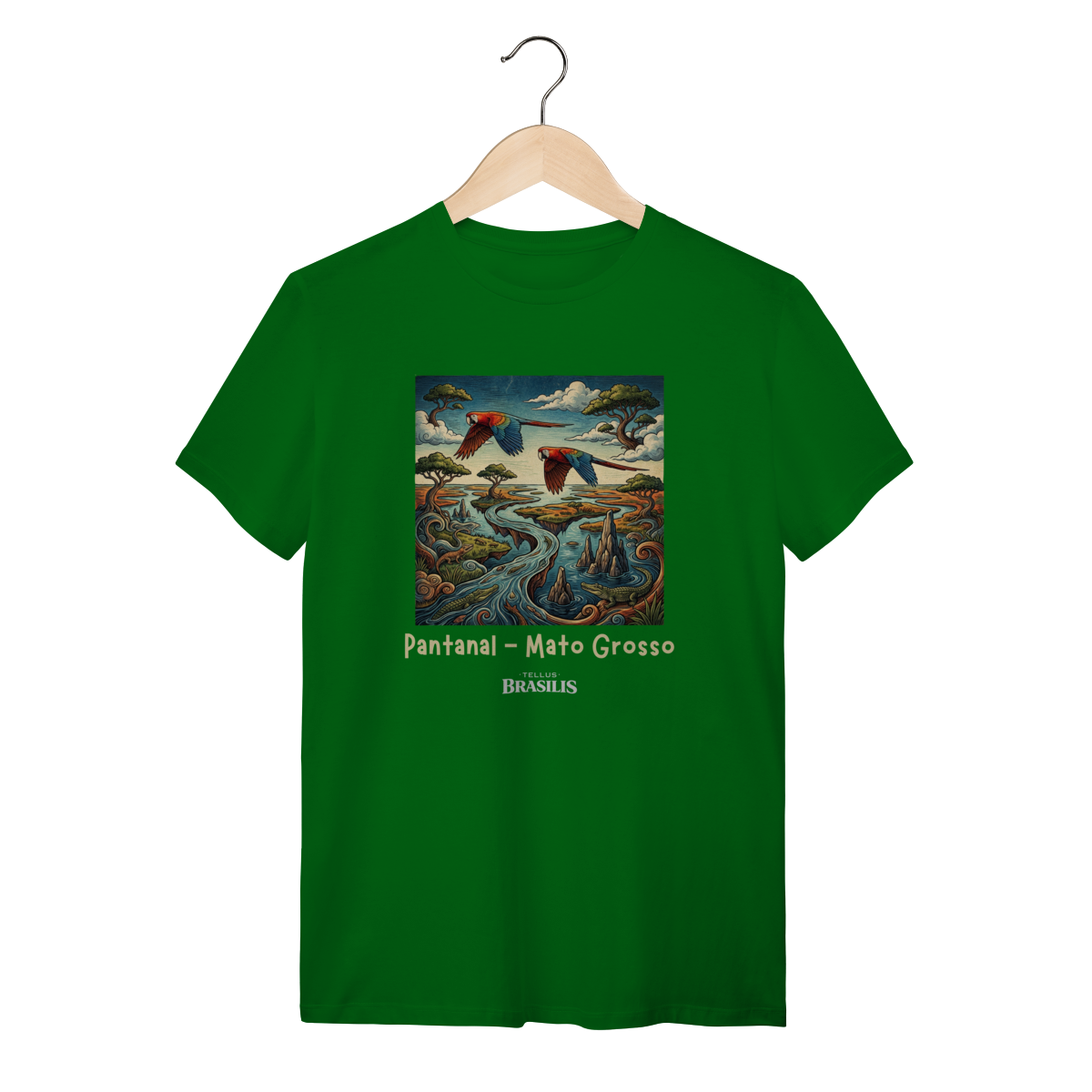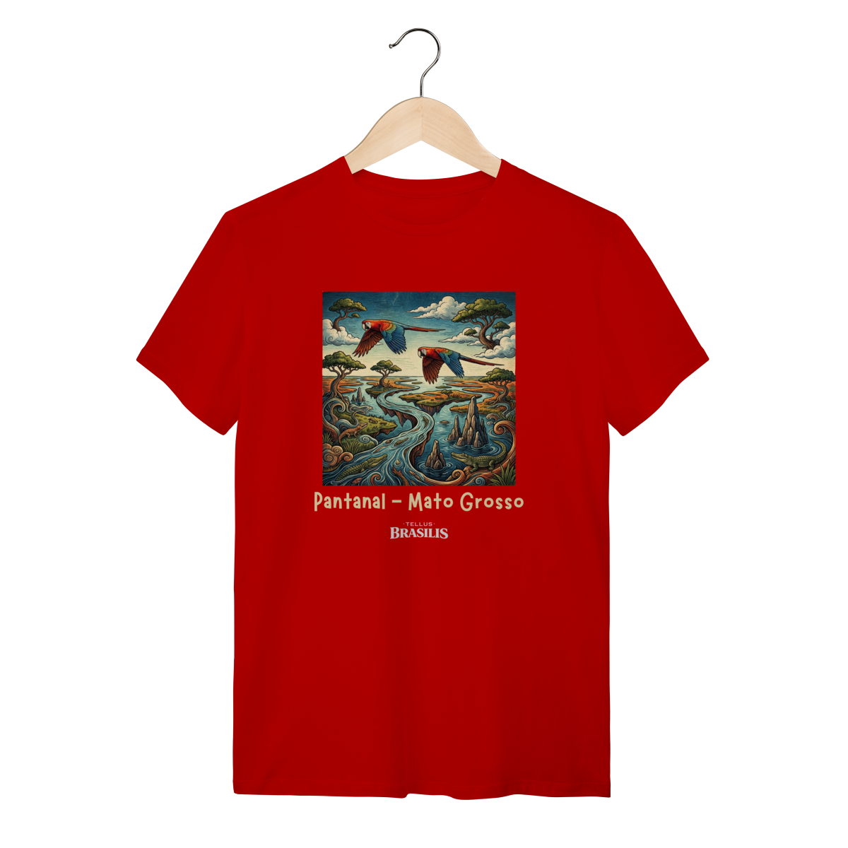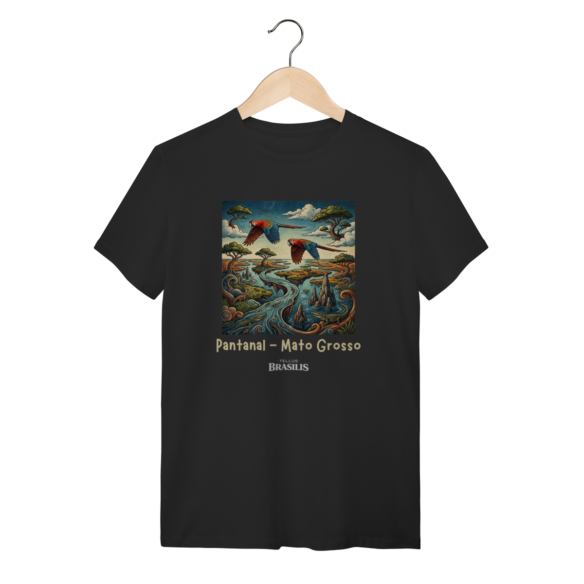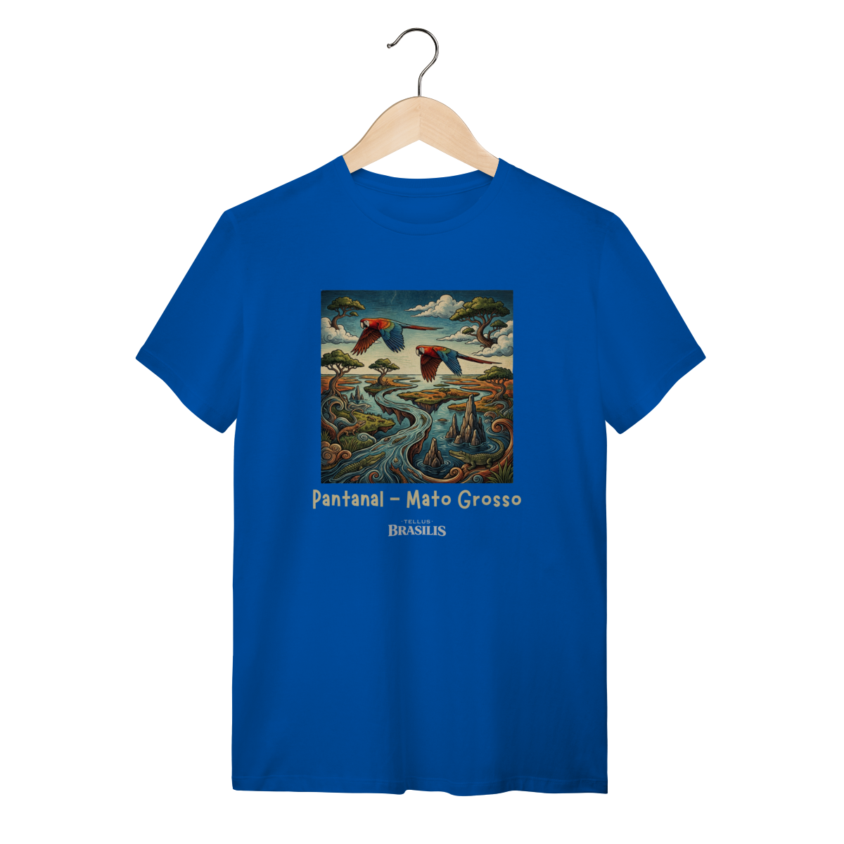 A estampa retrata a força e a beleza do Pantanal, em Mato Grosso, de forma artística e cheia de movimento. As araras, com suas cores vibrantes, cortam o céu pantaneiro simbolizando liberdade e a riqueza da fauna local, enquanto os jacarés surgem nas águas calmas dos rios e corixos, representando a vida selvagem que faz do Pantanal um dos ecossistemas mais impressionantes do planeta.