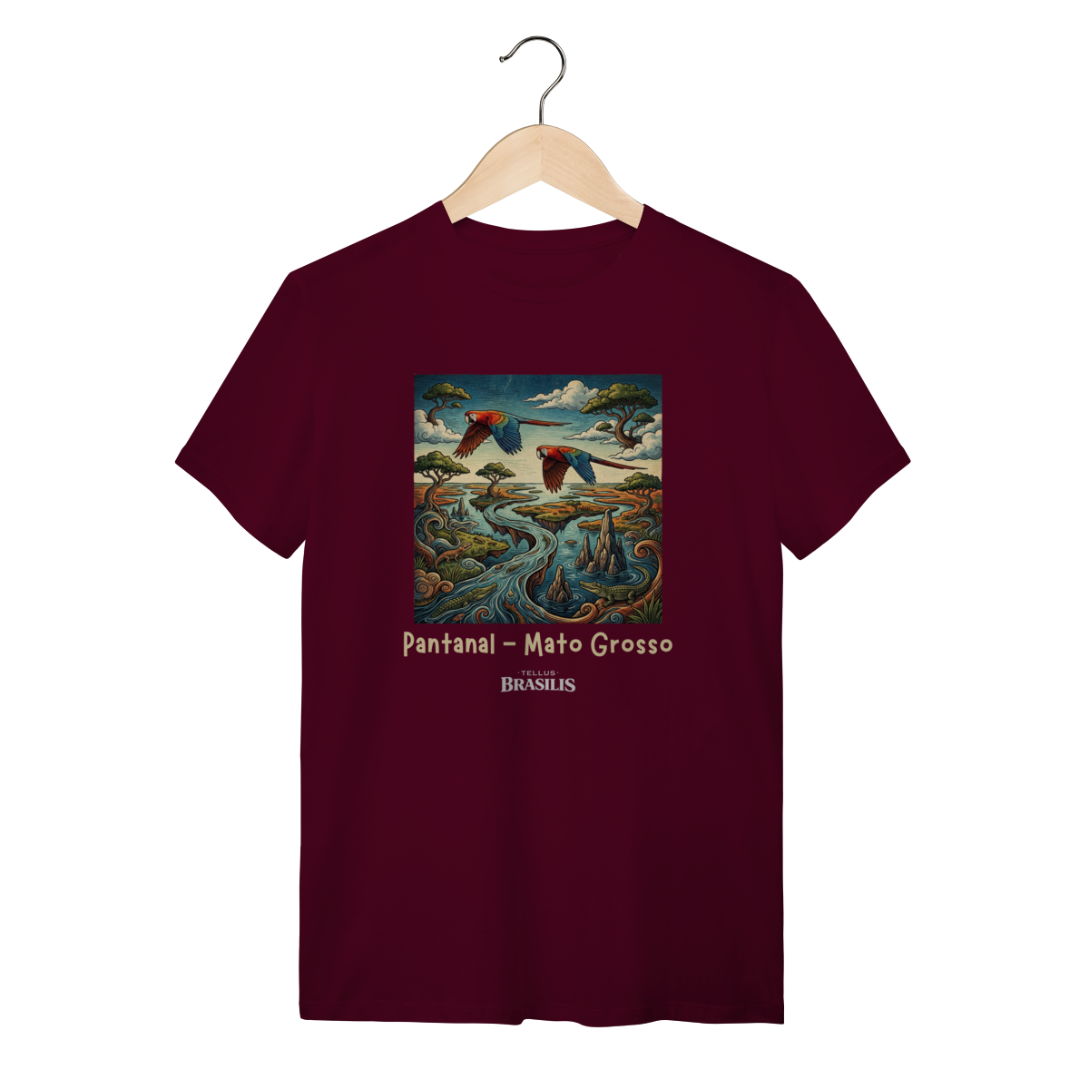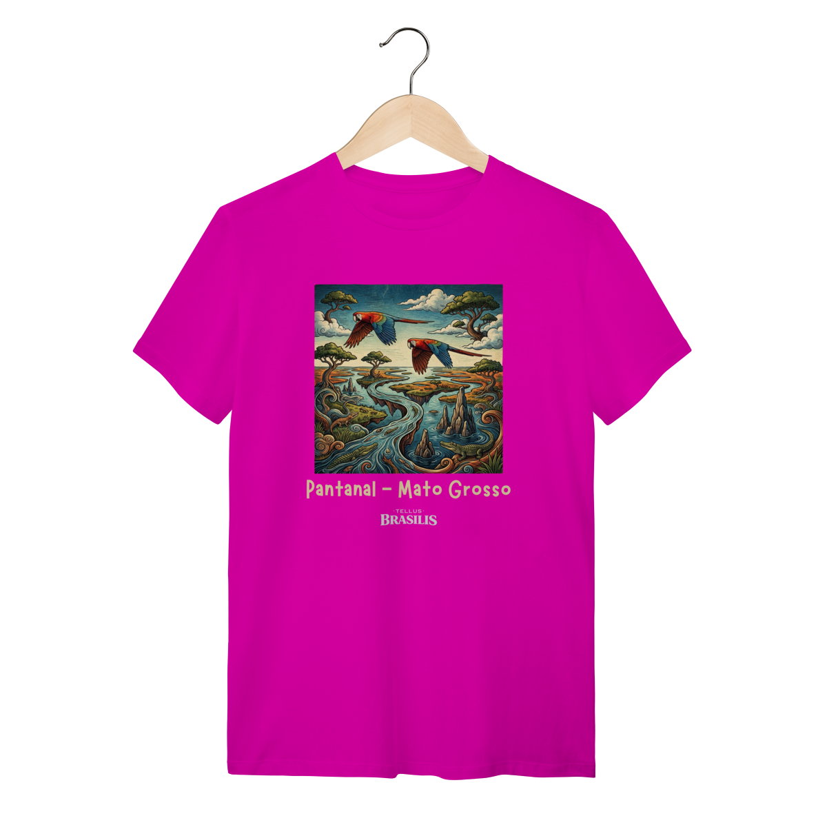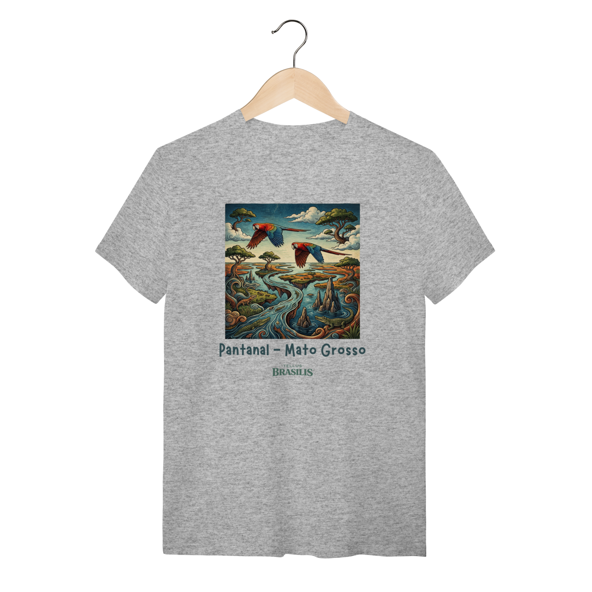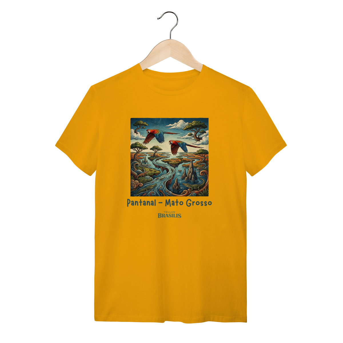 A estampa retrata a força e a beleza do Pantanal, em Mato Grosso, de forma artística e cheia de movimento. As araras, com suas cores vibrantes, cortam o céu pantaneiro simbolizando liberdade e a riqueza da fauna local, enquanto os jacarés surgem nas águas calmas dos rios e corixos, representando a vida selvagem que faz do Pantanal um dos ecossistemas mais impressionantes do planeta.