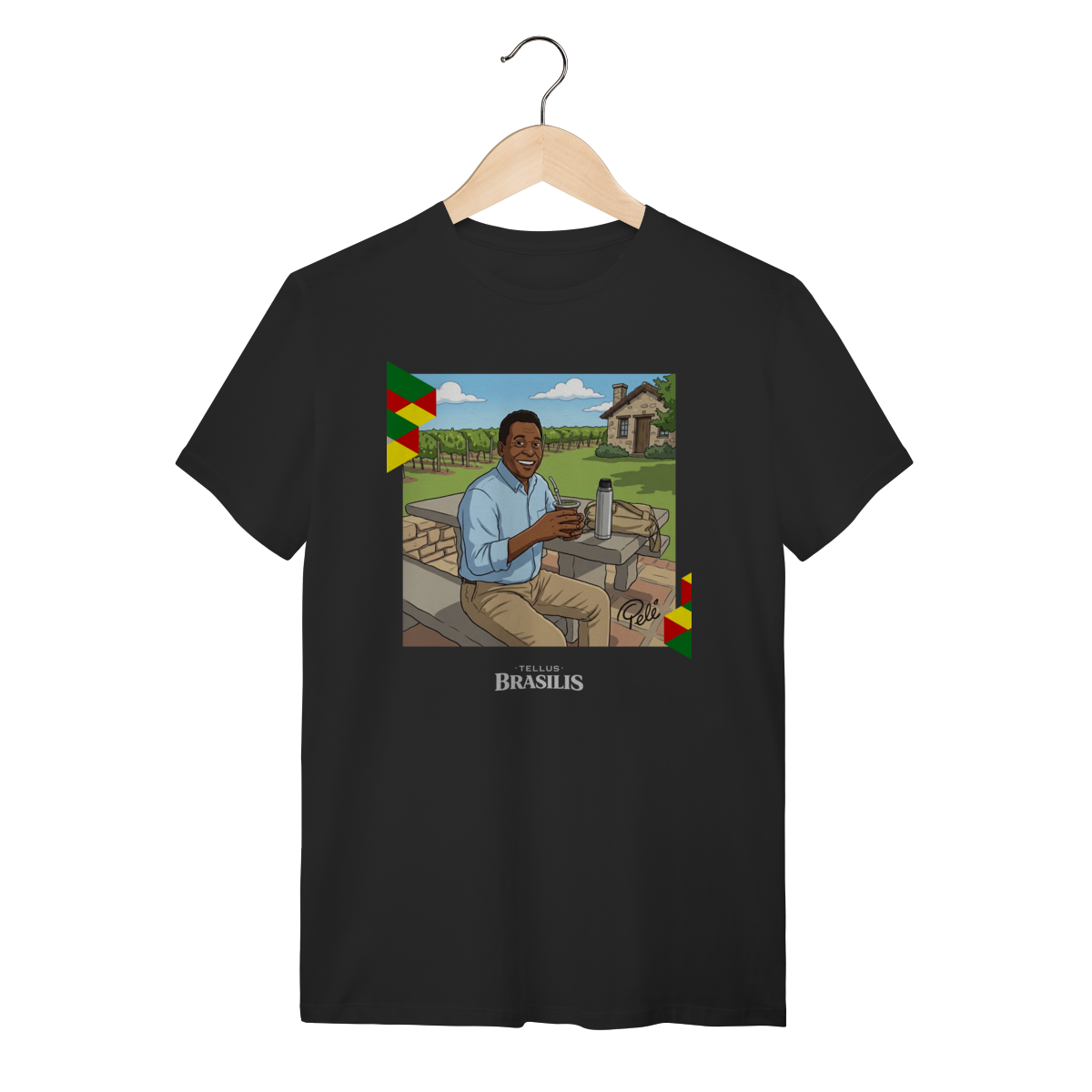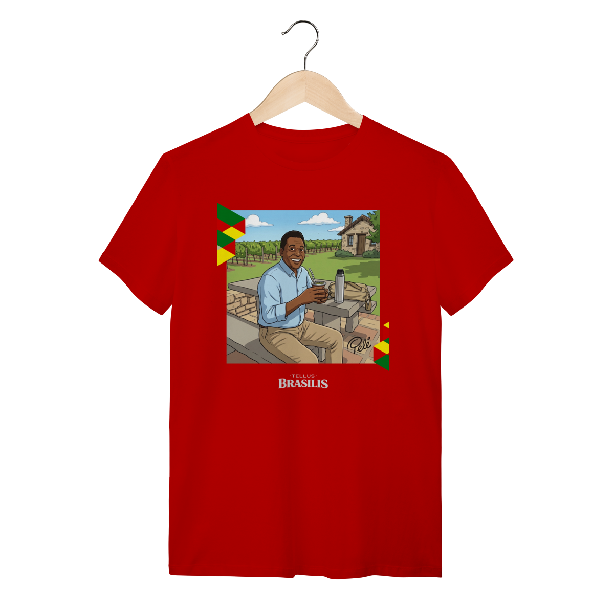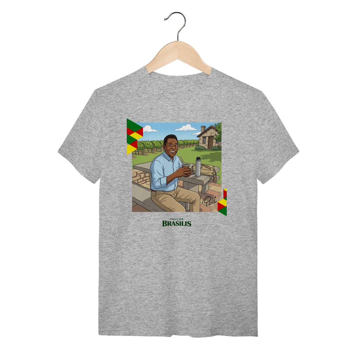 A proposta da estampa é unir cultura brasileira, esporte e humor criativo, mostrando que até os maiores nomes globais cabem numa roda de mate. Uma camisa pensada para quem gosta de peças originais, cheias de identidade e capazes de arrancar sorrisos e conversas por onde passam.
