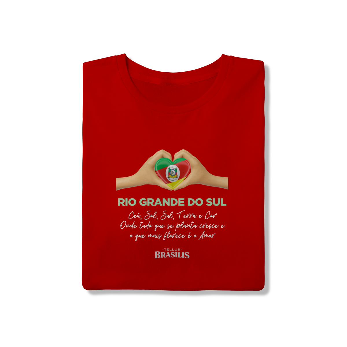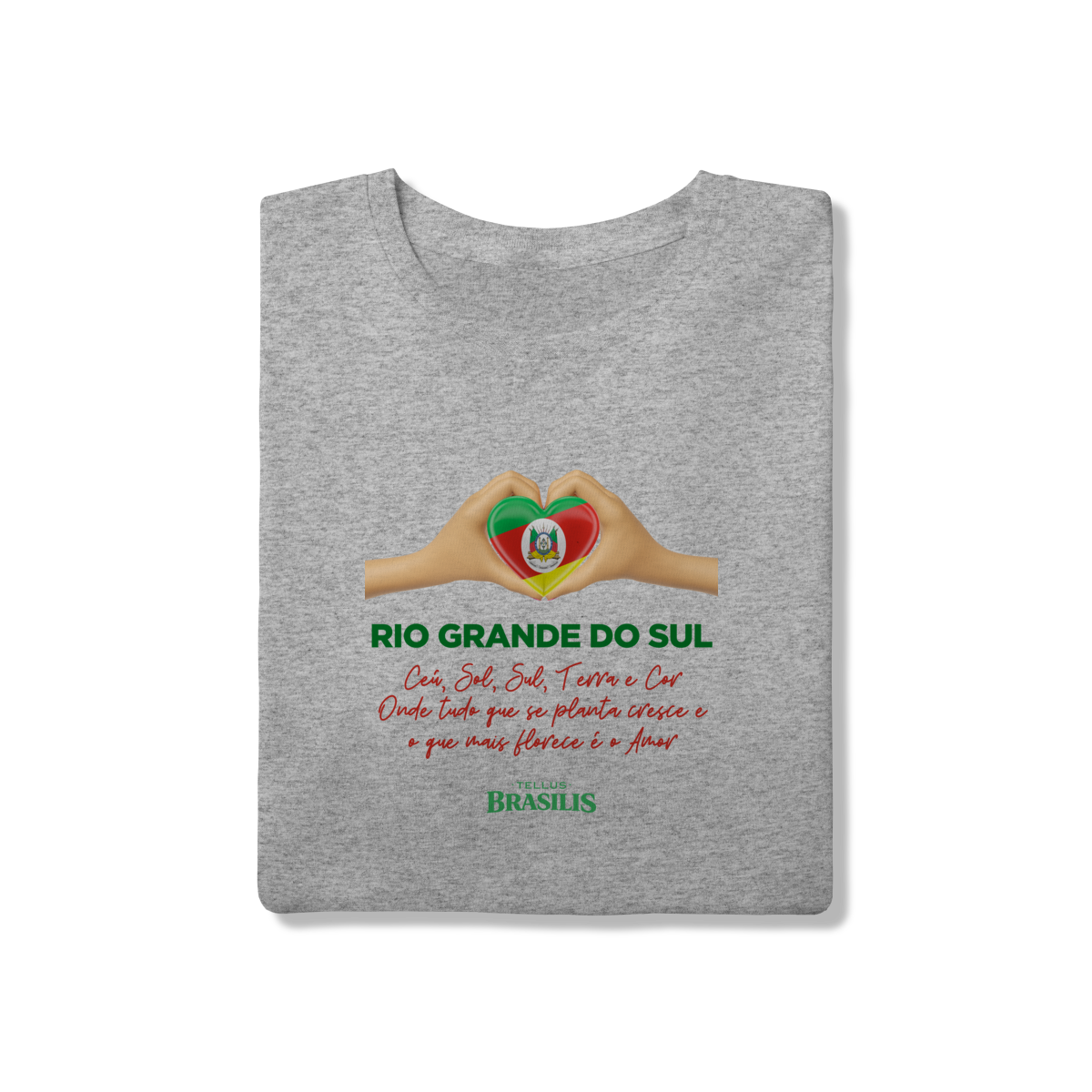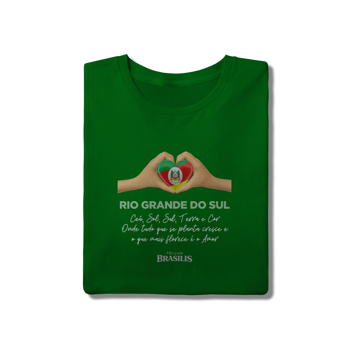 O coração formado pelas mãos, preenchido pelas cores da bandeira gaúcha, representa a ligação verdadeira entre o gaúcho e sua terra — um amor que nasce no chão, cresce no trabalho e floresce na união. A frase reforça essa identidade: aqui, tudo o que se planta cresce, e o que mais floresce é o amor pela tradição, pela cultura e pela história.