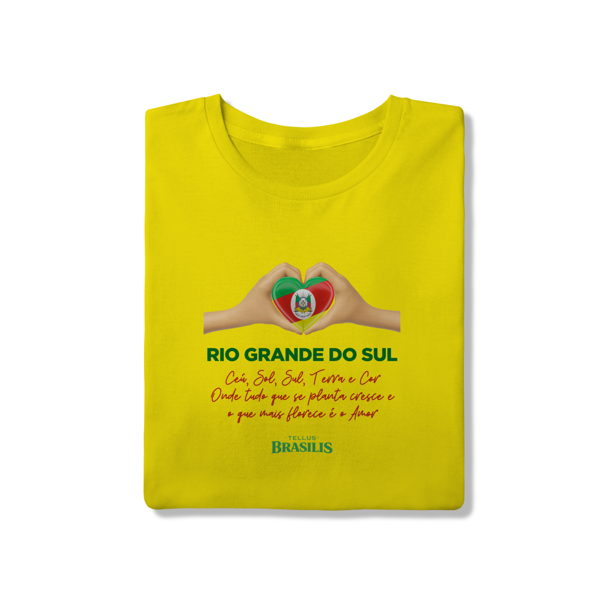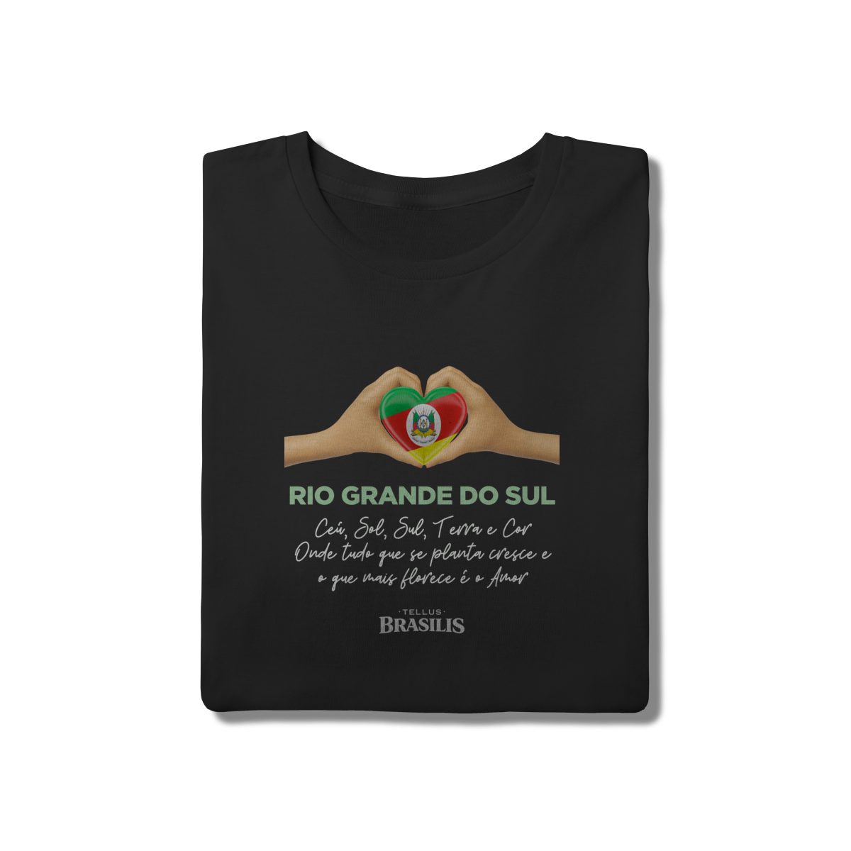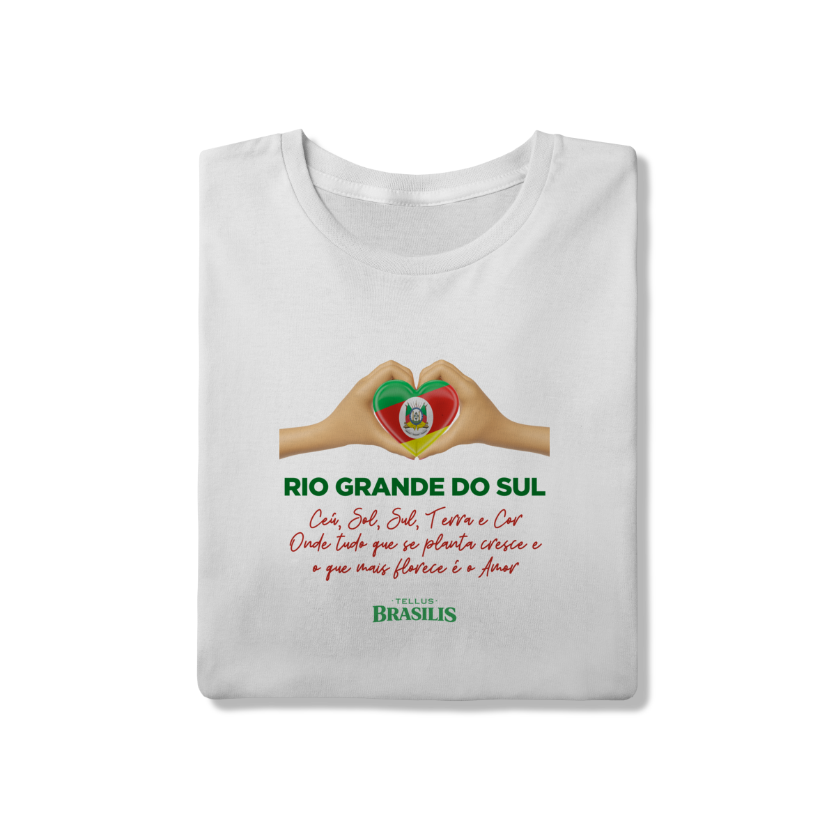 O coração formado pelas mãos, preenchido pelas cores da bandeira gaúcha, representa a ligação verdadeira entre o gaúcho e sua terra — um amor que nasce no chão, cresce no trabalho e floresce na união. A frase reforça essa identidade: aqui, tudo o que se planta cresce, e o que mais floresce é o amor pela tradição, pela cultura e pela história.